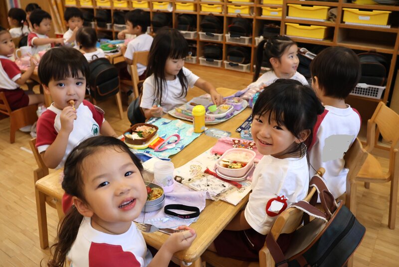 きょうは、「ランチタイム」の写真からスタートです。なぜなら、「いちご組」さんと「うさぎ組」さんが一緒になって「合同ランチ」を楽しんだんです。もちろん、座席もミックス。