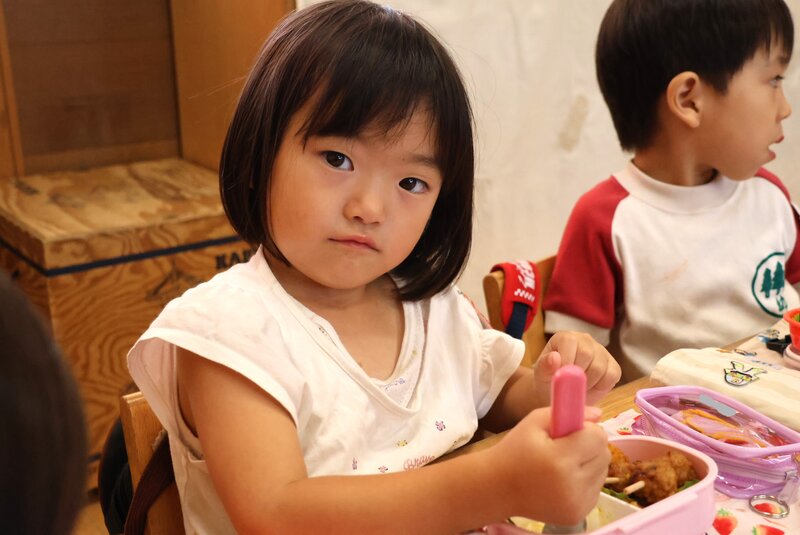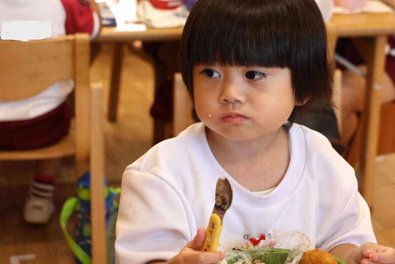 「うさぎ組」さんの先輩に混じってランチを楽しむ「いちご組」の皆さん。慣れない雰囲気に多少の緊張はあったかもしれませんが、食事の方は案外、スイスイと進んでいたようです。