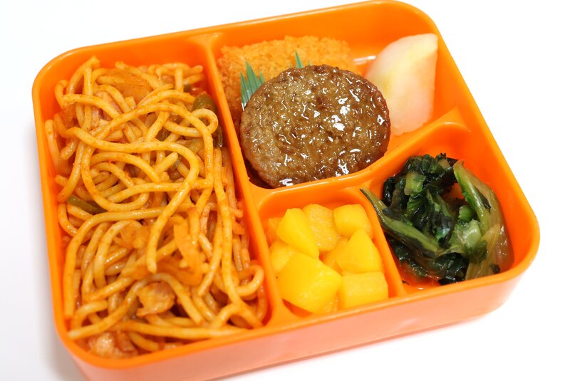ナポリタン、エビカツ、照り焼きハンバーグ、コンソメポテト、小松菜のお浸し、黄桃缶、394kcal