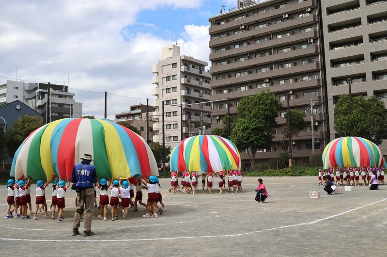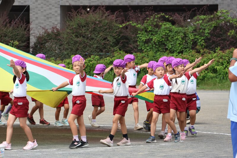 最後に登場したのは、年長さんです。最初は、「パラバルーン」のデモンストレーションから。なんと、これが最高の出来ばえでした。写真のように、風船も見事に膨らませることができました。クラス全員の息がぴったり合っている証拠です。