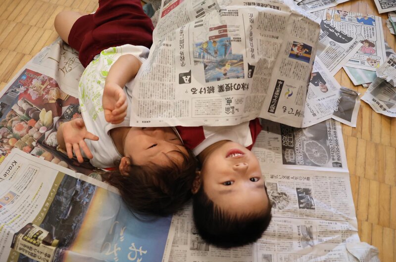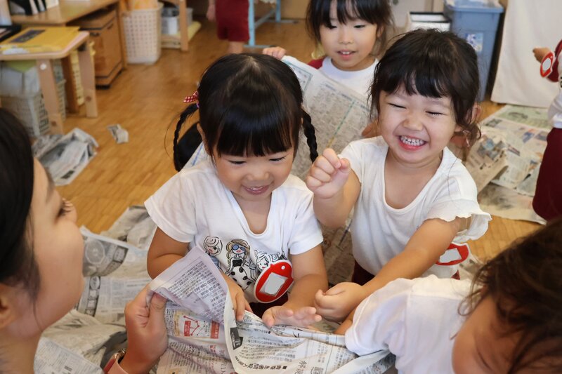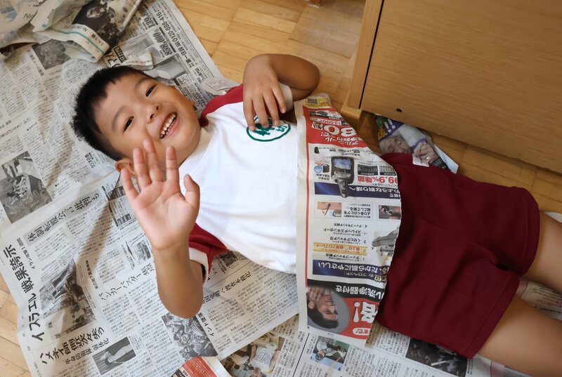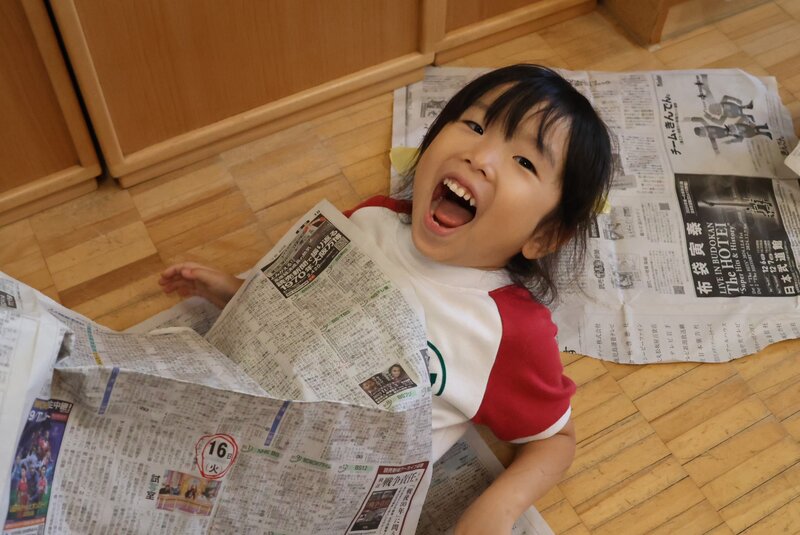 こちらのクラスも、激しさでは負けていません。それは、「りす組」さん。お部屋を覗いたら、床一面に新聞紙が……。