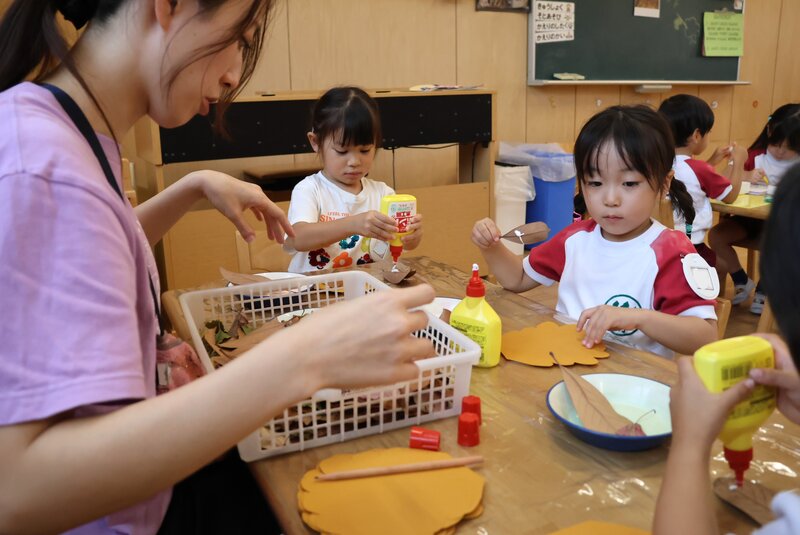 先生の手元にあるのは、「落ち葉」です。「どんぐり」といっしょに拾ってきたんですね。この「落ち葉」と「どんぐり」を台紙に貼っていくわけです。