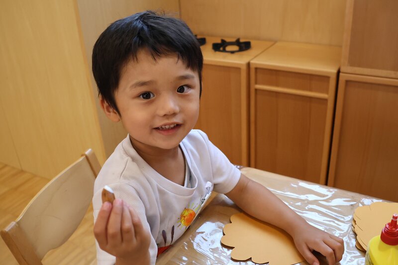 茶色の台紙に「どんぐり」と「落ち葉」……。秋の色彩でまとめられた製作は、どんな仕上がりをみせるのでしょう。楽しみですね。