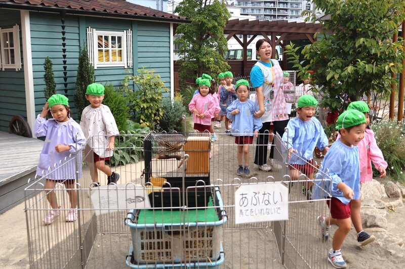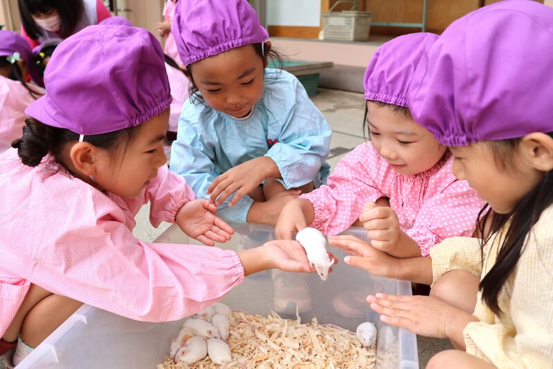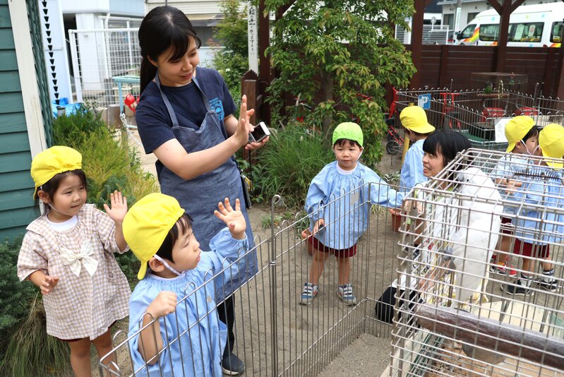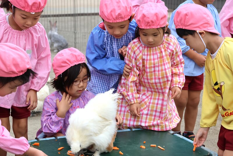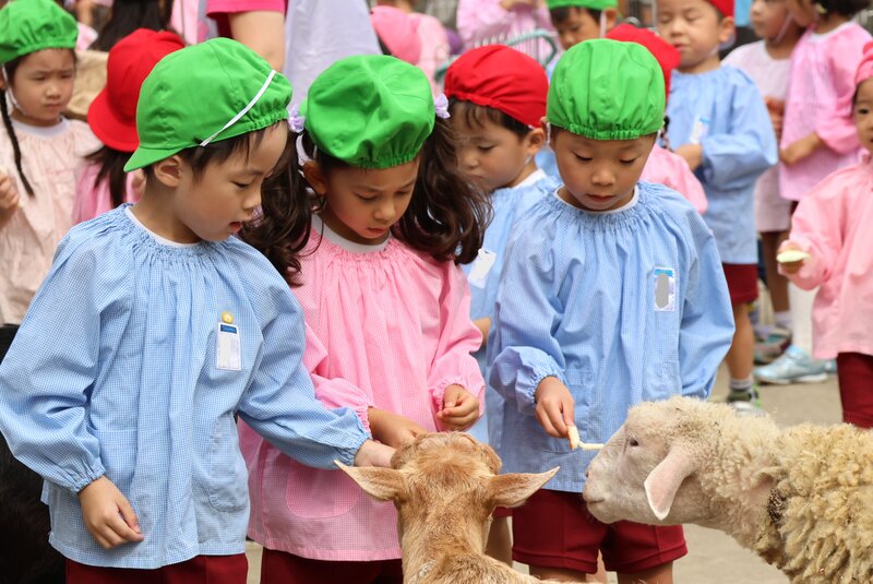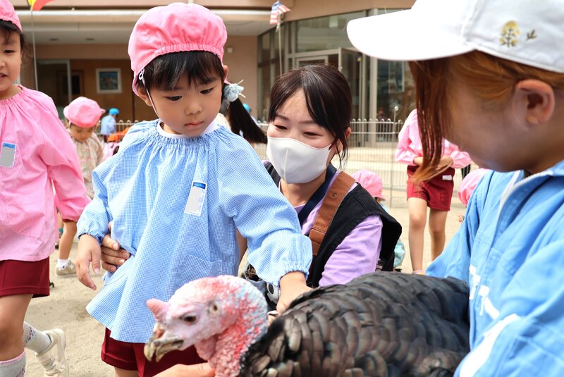 そんな感覚を楽しみながら、お子さまたちは少しずつ動物さんたちとの距離を縮めていました。「いちご組」さんも、「未知との遭遇」を思わせる表情を浮かべながら、先生やスタッフさんのアシストをいただきつつ、何とか動物さんたちとの触れ合いにトライ。「楽しむ」ところまで到達できたかどうかは微妙なところでしたが、動物さんたちとの「触れ合い」は、しっかり体験できたようです。