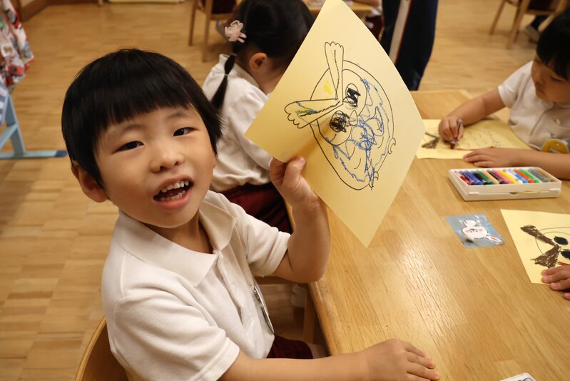 「ひよこ組」さんでは、「フクロウ」が登場。「フクロウ」の絵に色を塗って、オリジナルの「フクロウ」を仕上げていきます。
