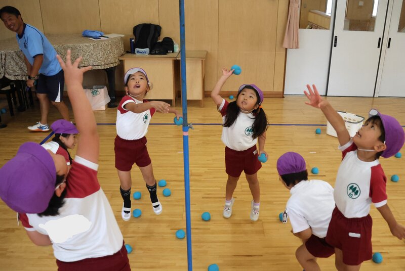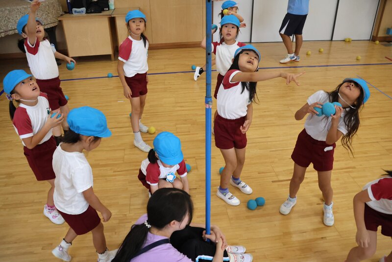 ですので、きょうは「玉入れ」にチャレンジしていました。クラスを2チームに分けたり、男子同士、あるいは女子同士に分けたりしつつ、ホールでは熱い戦いが繰り広げられ……、