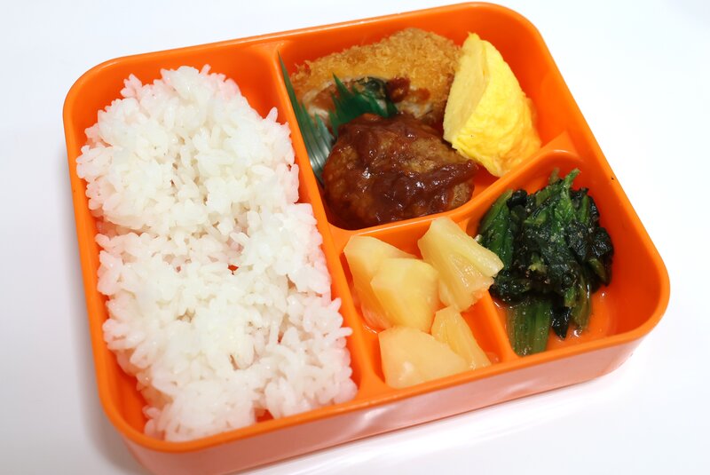 白飯、チキンロールフライ、トマトソースハンバーグ、オムレツ、ほうれん草のごま和え、パイン缶、346kcal、ごちそうさまでした。