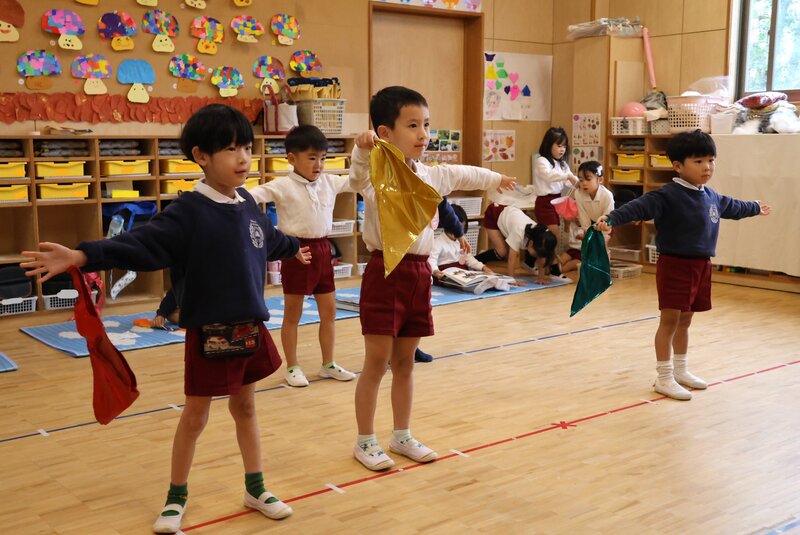 そして、小道具のほとんどは先生たちのお手製なんです。保育後には、今年も一生懸命に小道具をつくる先生たちの姿があります。いまはまだ、それらの小道具が登場する段階ではないようですが、もう少し練習が進みますと、練習風景とともにご紹介できるかもしれません。小道具が登場しますと、よりリアリティが増しますので、それもまた楽しみです。