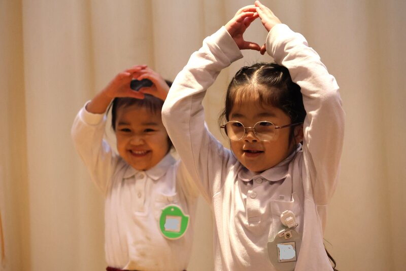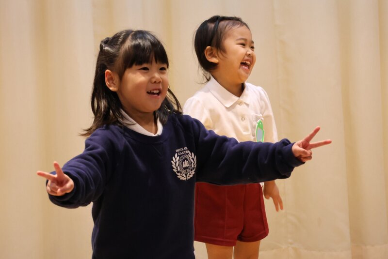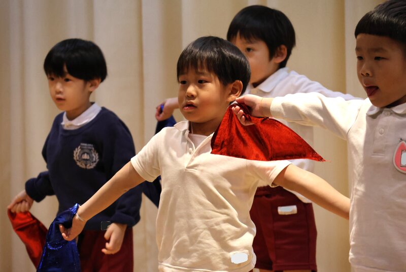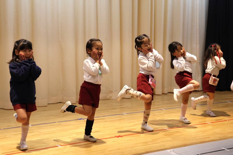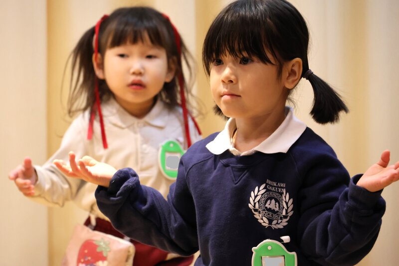 続いてご紹介するのは、年中の「ゆり組」さんです。「ゆり組」さんは、はやくから小道具を使った練習をはじめていましたので、小道具の使いこなし方にも進展がみられるのではないでしょうか。