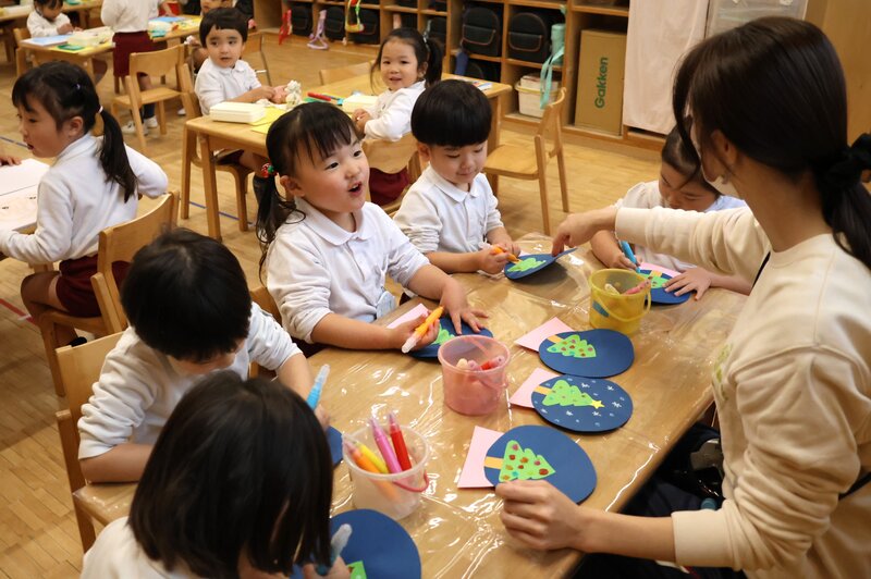 そのお隣の「うさぎ組」さんでは、クリスマスに向けた製作が進行中。きょうは、ペンでツリーに飾り付けをしていたようです。