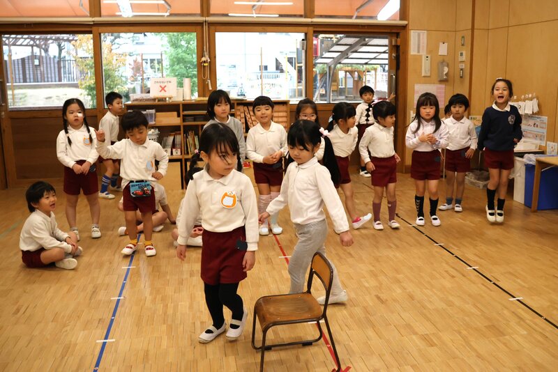「いちご組」さんのイスは内側に向いていましたが、お隣の「ひまわり組」さんのイスは、外側を向いていました。どうやら、こちらは「いす取りゲーム」で盛り上がったようです。ただいま、決勝戦の真っ最中。外野の応援も熱を帯び、外の寒さを感じさせない熱い空間を演出していました。