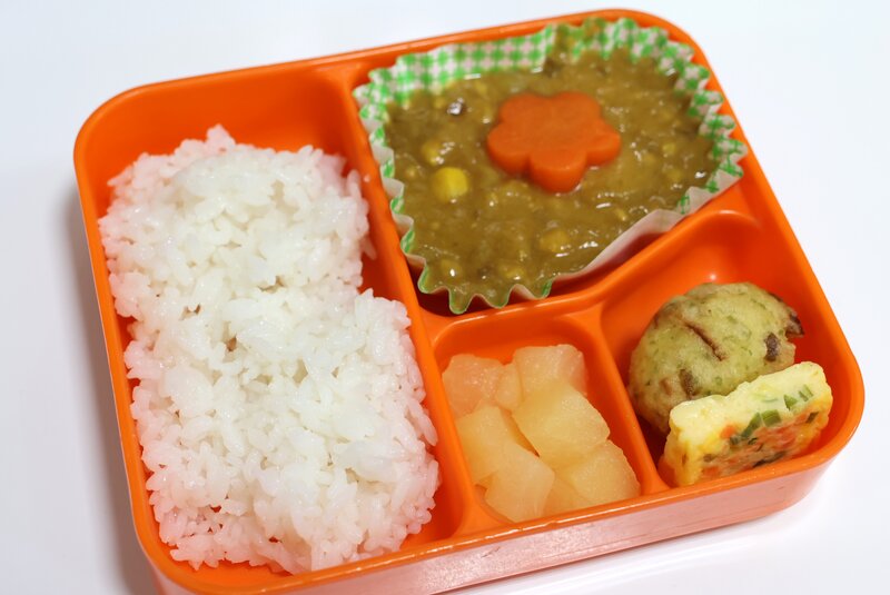 あたたかな白飯、カレー、花型にんじん、ちくわのチーズ磯部揚げ、ミニ四角たまご焼き、リンゴ缶、418kcal