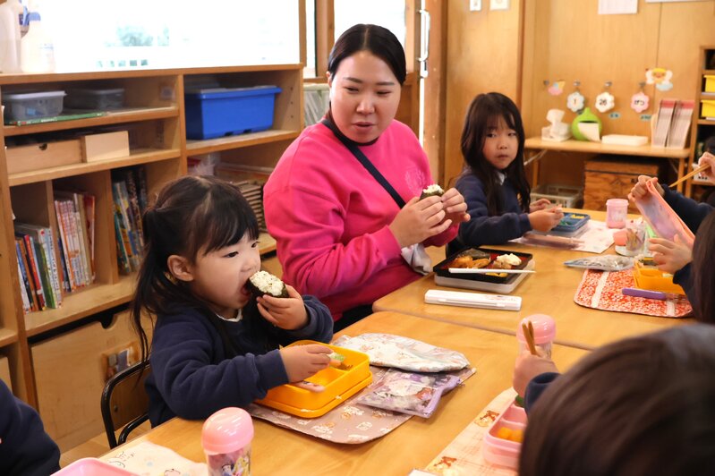 「いちご組」さんの先生です。「すぎのこ de あそぼう」に参加されたお客さまのお見送りを終えたjimjimに「きょうは、つき組さんといっしょにランチをします」とのこと。しかも、全員いっしょではなく、「いちご組」さんの半数が年長の「つき組さんへ行き、「つき組」さんからも「いちご組」さんにやってくるという「トレード方式」での合同ランチと聞いて、「なかなか面白い企画だな」と思いました。