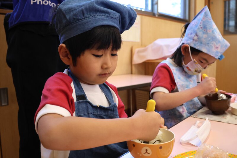 そして、こちらはお隣の「ひまわり組」さんです。「ひまわり組」さんは、体操指導でたっぷり運動をしてからの「つくってたべよう」でしたから、おなかペコペコからのスタートだったかもしれません。