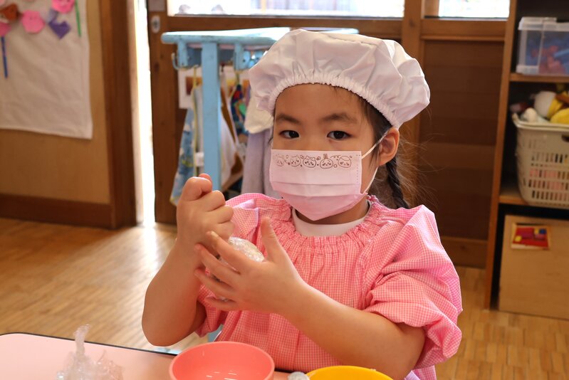 年中さんの「つくってたべよう」では、「おにぎり」をつくります。具材は、「鮭」「塩こんぶ」「シラス」の3種類。