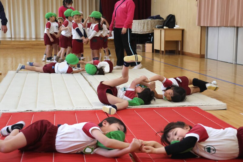 ふたり一組になっての「お芋コロコロ」。こちらなんか、もうふたりの息が合わないと大変な騒ぎです。