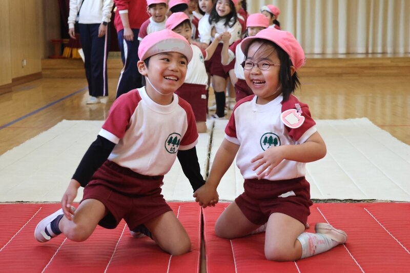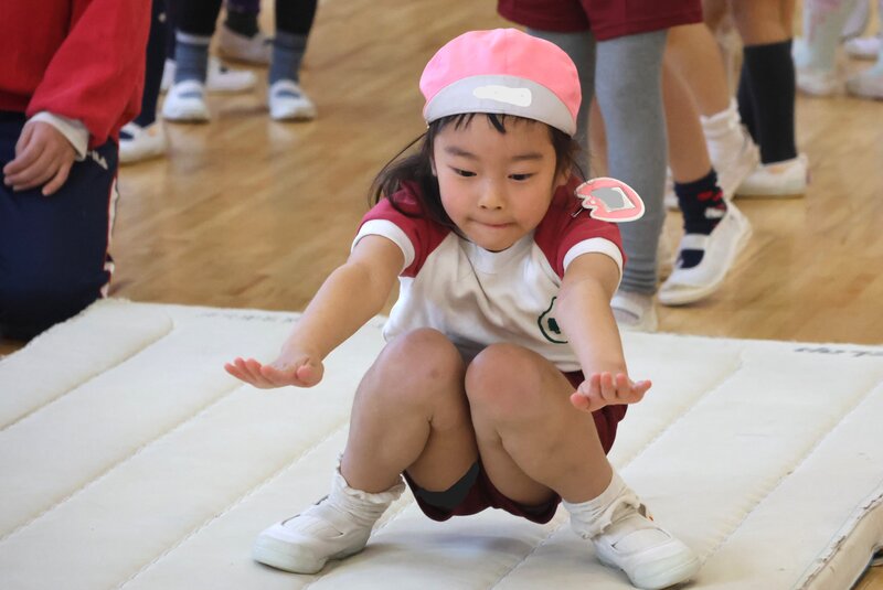 年中さんは、金曜日なので「体操指導」がありました。きょうのテーマは、「前転」です。こちらの女の子は、クルッとまわってフィニッシュが決まったところ。バッチリですね。実は、この「前転」の練習に入る前に何段階かのトレーニング・メニューがありまして……、