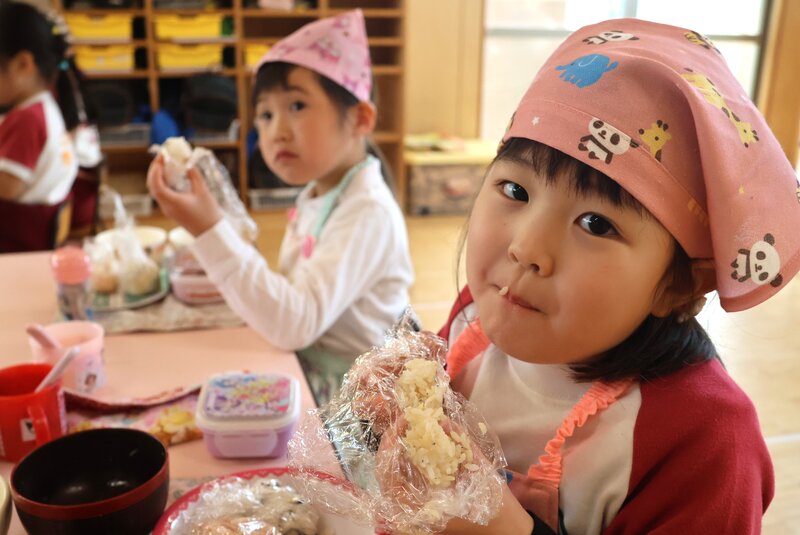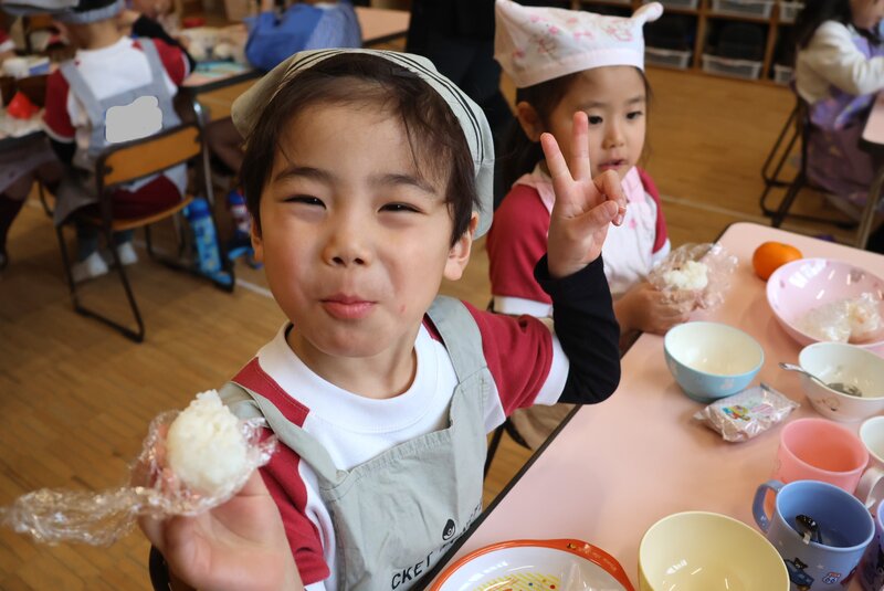 年中さんがつくってたべるのは、「おにぎり」でしたね。先週、「ひまわり組」さんがすでにチャレンジしていました。