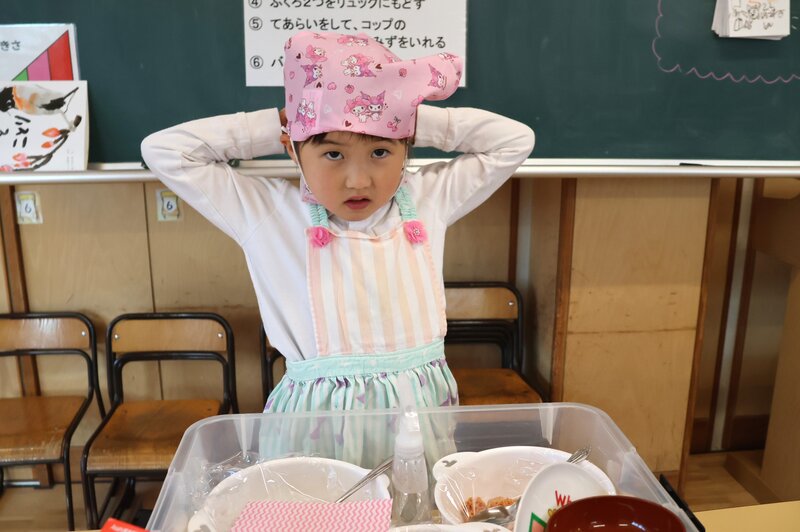 「体操指導」の内容がハードだったので、もうこの時点でおなかペコペコなのではないかと思いますが、そこはしっかりとガマン。身支度を整えて、おいしいお昼ごはんをつくってたべましょう。