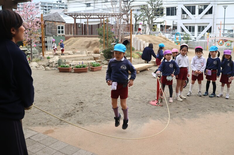 園庭では、写真のようにフリーの先生がお子さまたちを対象として「大縄跳び」の会場を設けていました。実は、いまの杉之子ではこの「大縄跳び」が一部のお子さまたちに密かなブームを呼んでおりまして……、