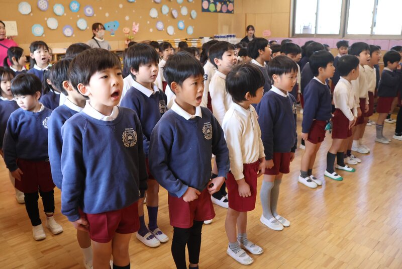 1枚目の写真は、年長さんが卒園式のうたの練習をしている場面です。きょうは、系列校の専門学校から、音楽大学出身の先生が来て、うたの指導をしてくれました。でも、年長さんのうたがとても上手なので、具体的な「指導」というのは、ほとんどありませんでした。むしろ、先生のほうが年長さんのうたのレベルに驚いていたくらいです。