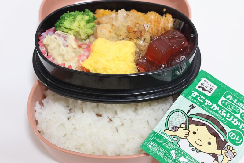 青菜ふりかけごはん(ふりかけは、お子さまが自分でふりかけます)、エビフライ、鶏肉のチーズ焼き、星のオムレツ、さつま芋のサラダ、ブロッコリー、デザート 482kcal