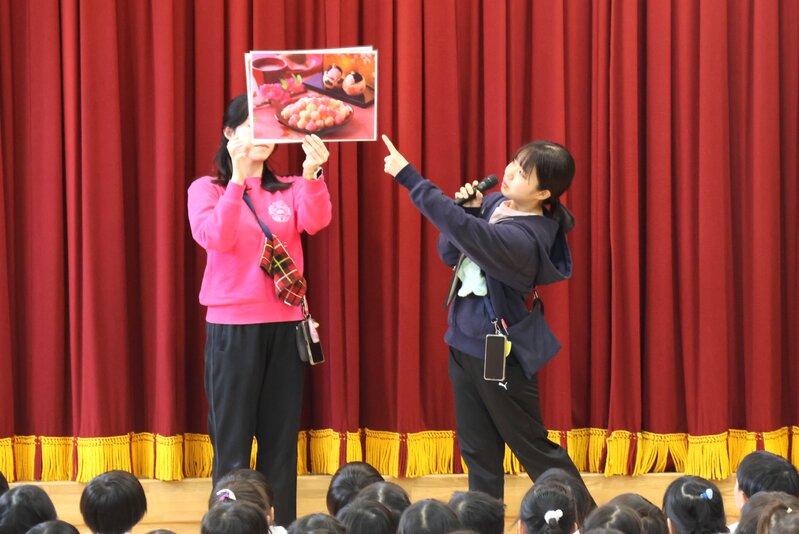 さて、ここからはきょうのメインテーマである「ひなまつり会」のようすをお伝えしてまいりましょう。きょうは、3月3日ということで、全員がホールに集まって「ひなまつり会」を開きました。まず、司会の先生が「ひなまつり」に関連する「ひなあられ」や「ひしもち」についてお話をしてくれました。