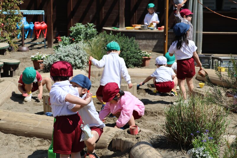 先生のお話しが終われば、さあ、待ちに待った「おあそびタイム」です。お砂場はもちろん、「のこのこやま」を登ったり下りたりするときや……、