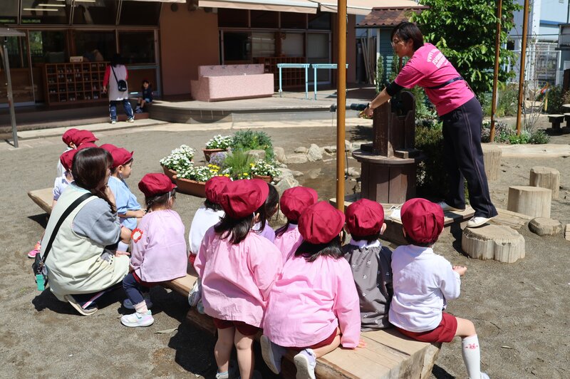 そして、そのお子さまたちの中には、スペシャルなメンバーの姿が……。そう、新しく加わった「すぎのこのなかまたち」もまた、他の年少さんより一足早く「園庭デビュー」を飾ったのであります。でも、すぐに「おあそび」に入れるわけではありません。園庭あそびには、いくつかのルールがあります。まずは、先生からそのルールについてのお話がありました。