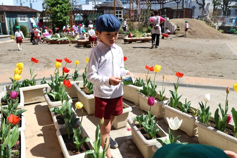 では、「きょうのすぎのこ」です。きのうまでの雨が上がって、きょうはあたたかな一日となりました。陽ざしもたっぷりでしたので、久しぶりに園庭がオープン。満開のちゅうりっぷが、お子さまたちを出迎えてくれました。