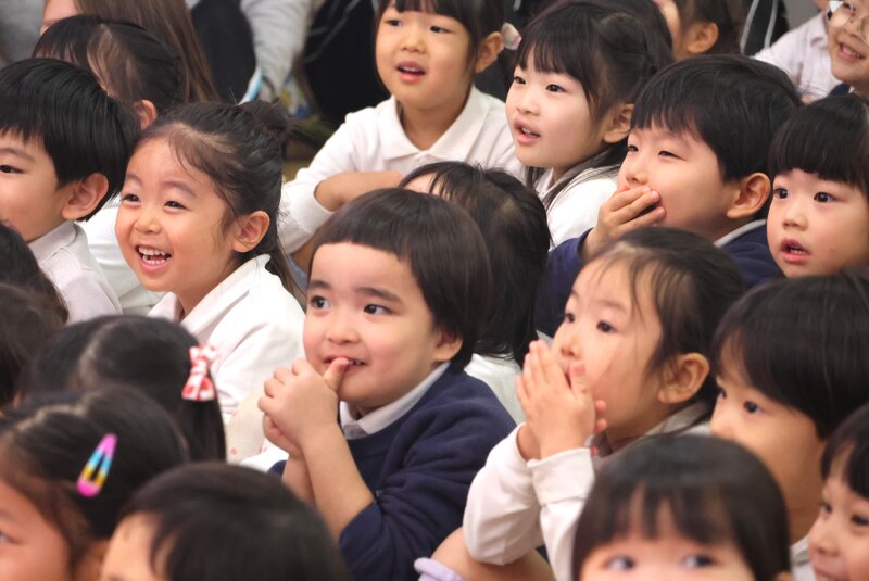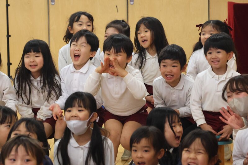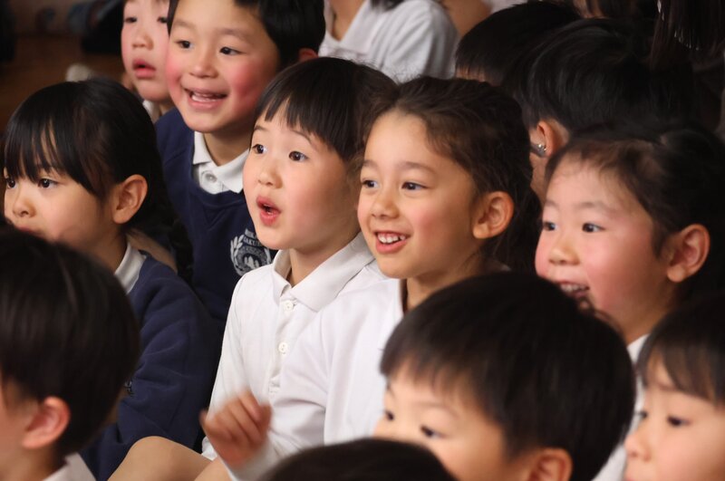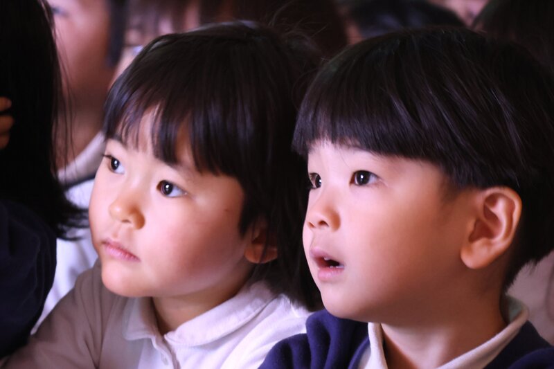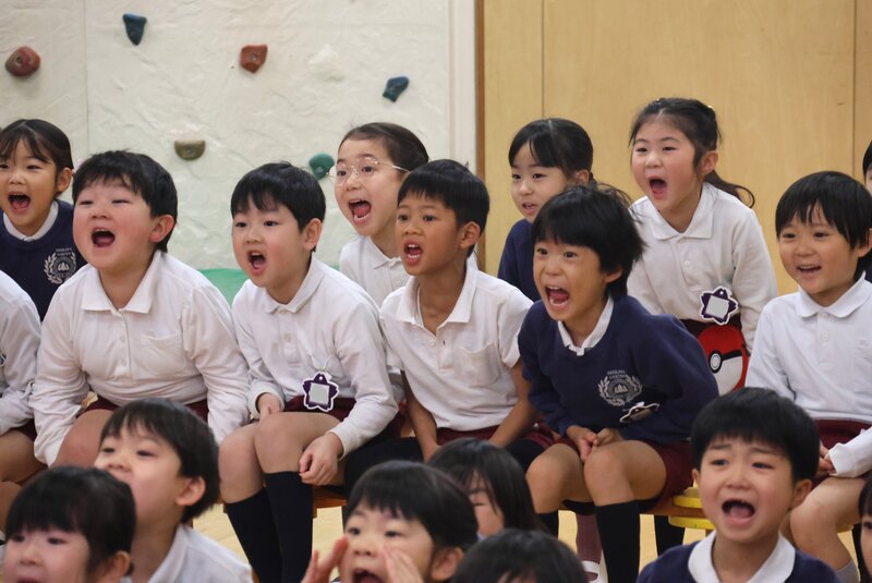 では、「きょうのすぎのこ」をお伝えしてまいりましょう。きょうは、「朝の会」のあと、お子さまたち全員が2階のホールに集まりました。これから、いったい何がはじまるのかといいますと……、