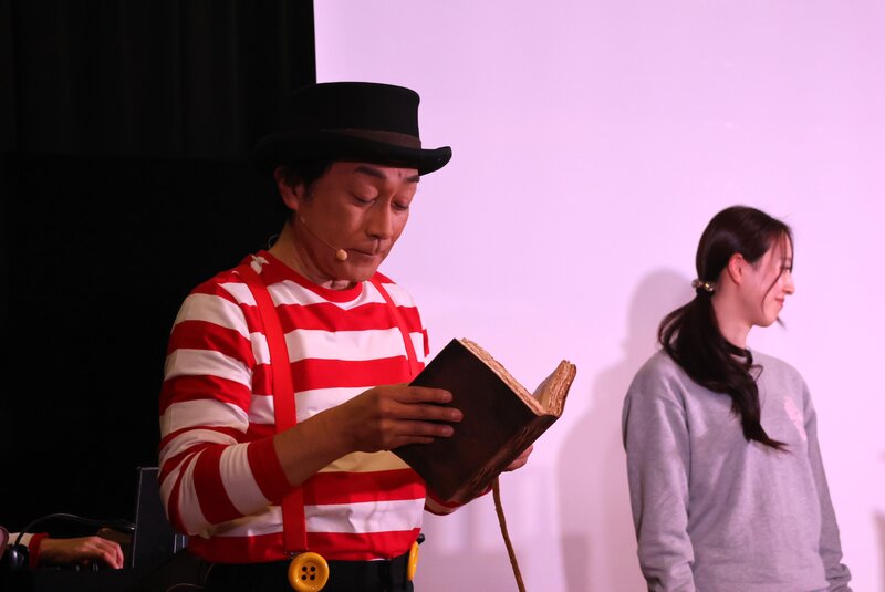 ゆうさんは、ステージの隅に行き、一冊の古い本を取り出しました。どうやら、この本には太古の昔から伝わるマジックの「おまじない」が書いてあるようです。