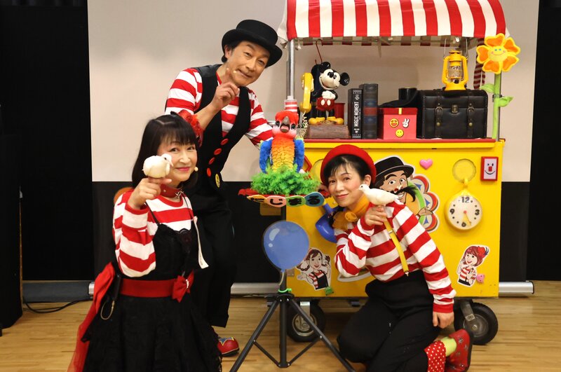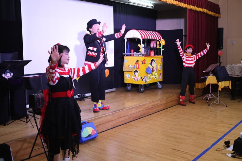 杉之子幼稚園にたびたびご来園いただいている「ゆうさんの紙芝居&マジック・ショー」の皆さんです。きょうも、3人の息がピッタリ合った楽しいパフォーマンス・ショーをみせてくれました。では、さっそくそのショーのもようをご紹介してまいりましょう。