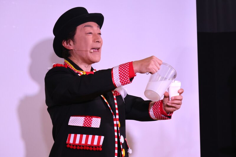 さあ、いったんクールダウンしたところで、ここからは一気に盛り上がりをみせていきます。まずは、牛乳の入ったコップを筒で隠すマジックです。ふつうですと、コップに筒を被せたら、そのままコップが消えてしまうはずでしょう。ここでも、そういう想定で進んでいきます。