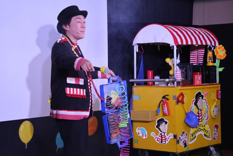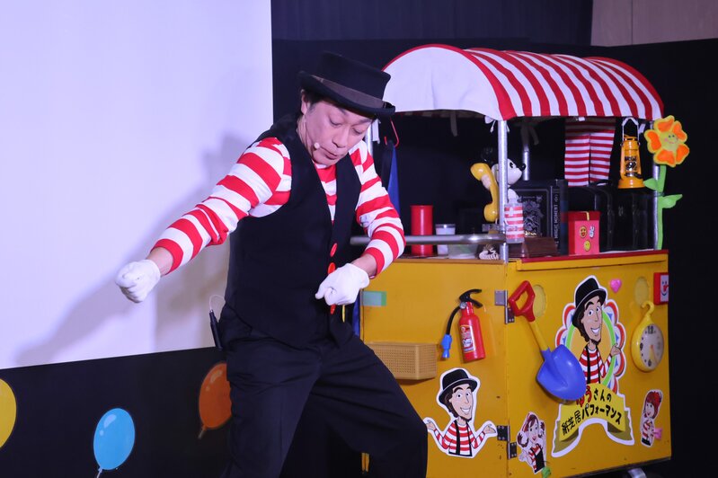 さらに、パフォーマンスは続きます。こちらは、ゆうさんお得意のパントマイム。「つなひき」から「窓ふき」へと進み、ラストは「風船」をふくらますようすを見事なパントマイムを披露。