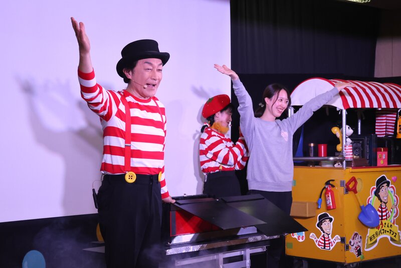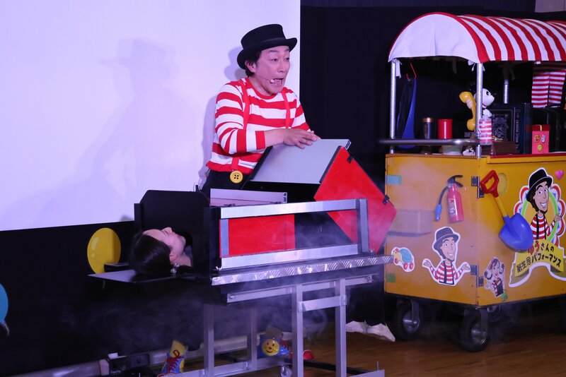 「本物のハトだ。いったい、どこからやって来たのだろう……」。衝撃的な展開に、なんとなく息を飲むお子さまたち。いやいや、このくらいはまだまだ「序の口」ですよ。きょうのショーは、このあと一瞬たりとも目が離せない内容で突き進んでいきます。