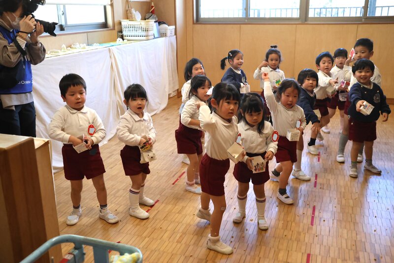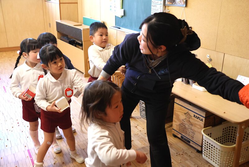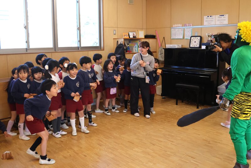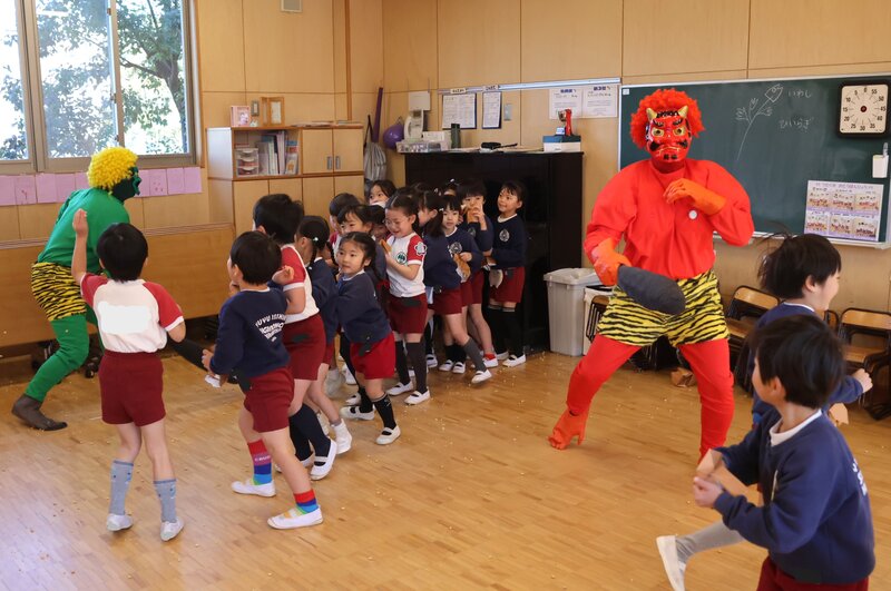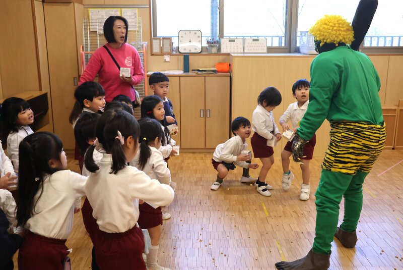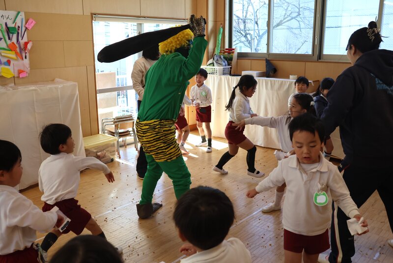 しかし、年少さんを甘く見ていた鬼さんたちは、ここでもたっぷり「豆」を投げられて完敗。