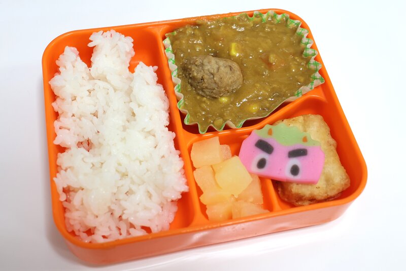 あたたかな白飯、カレー、ミートボール、おにさんかまぼこ、豆腐ナゲット、リンゴ缶 443kcal