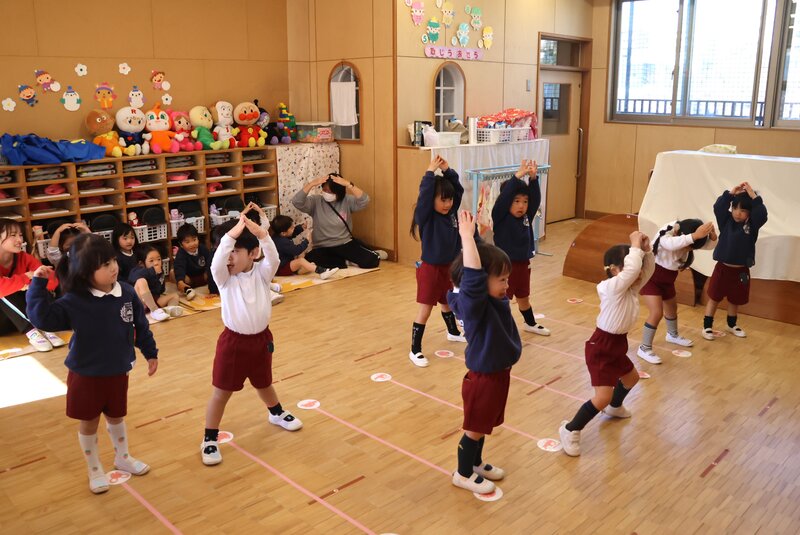 では、「きょうのすぎのこ」です。きのうは、かわいらしい「鬼」さんの衣装でコワい「鬼」さんを驚かせた「いちご組」さんのお子さまたち。きょうは、お部屋でダンスの練習をしていました。床をみますと、立ち位置の線が引いてあって、なんだか本格的です。それもそのはず……。