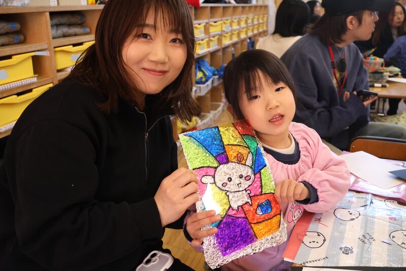 そして、きょうの最後を飾るのは、こちら。年長さんの「おやこ de あーと」です。きょうは、年長さんの保護者の方にご来園いただき、お子さまと一緒に製作を楽しんでいただきました。何をつくったのかといいますと……、