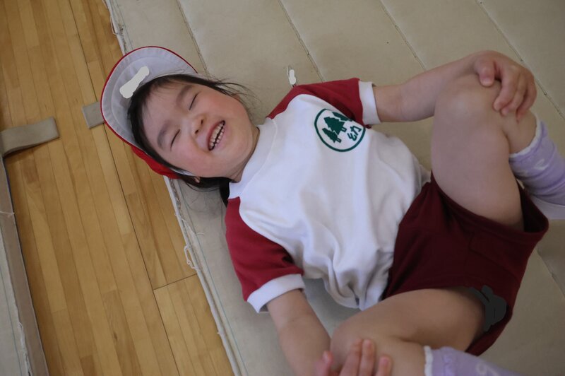 お芋コロコロの「ジャガイモ」版です。「お芋コロコロ」は、全身を伸ばしてコロコロ転がりますが、「ジャガイモコロコロ」は、足を折りたたんで転がります。これらをひととおり経験したところで、いよいよ本命の「前転」の練習に入ります。