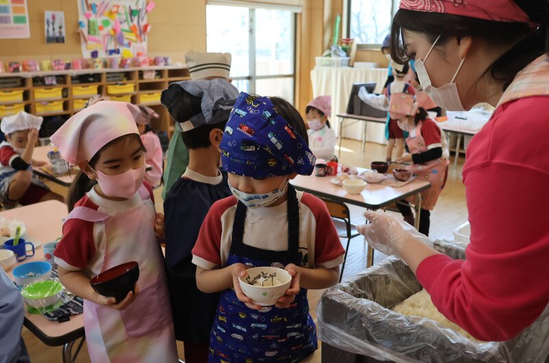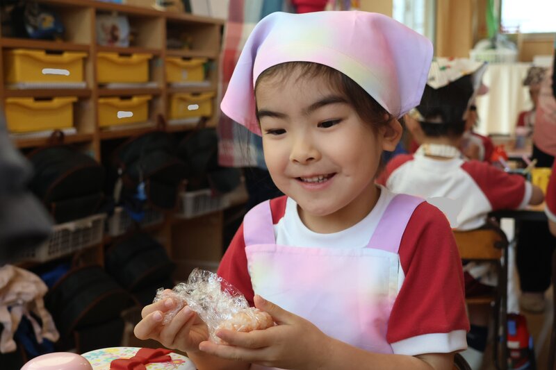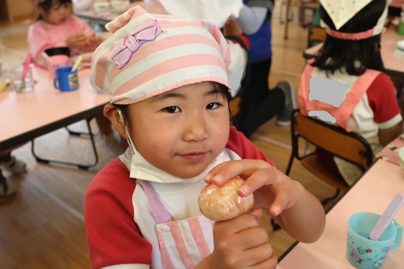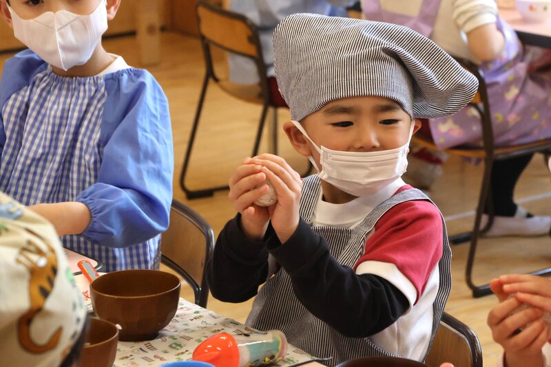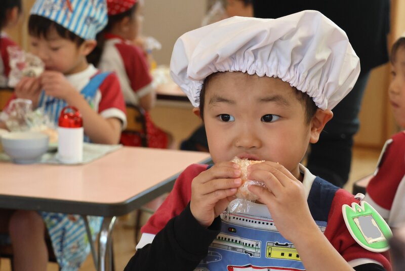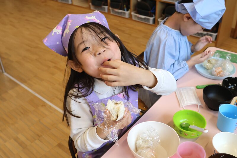 年中さんがつくってたべるのは、「おにぎり」でしたね。先週、「ひまわり組」さんがすでにチャレンジしていました。