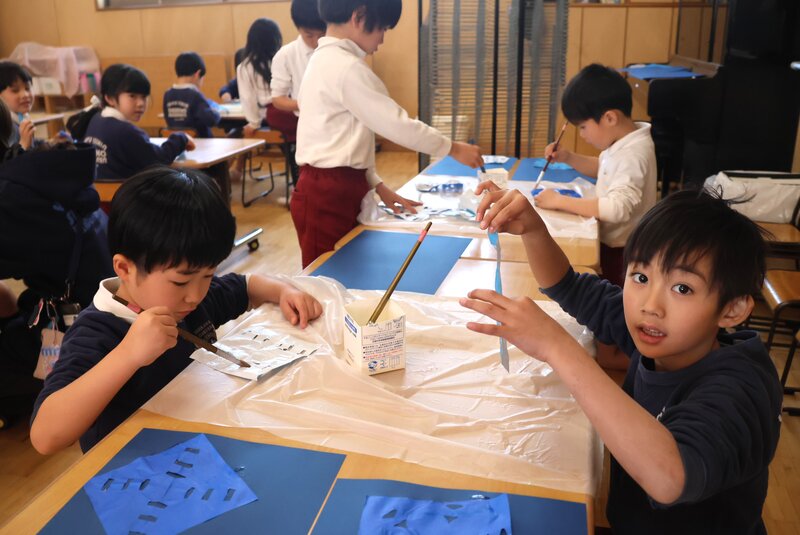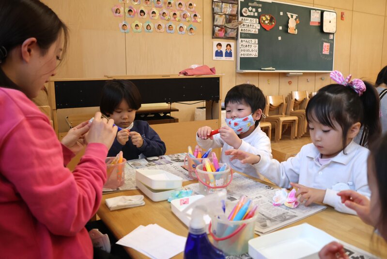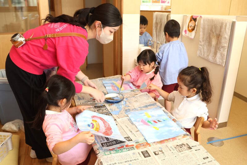 「うさぎ組」さんは、キッチンペーパーに水性ペンで色をつけ、それに霧吹きで水を吹きかけて滲ませていました。とても柔らかな感じの色彩になっていたのですが、それがこの先どうなるのかは、お楽しみです。