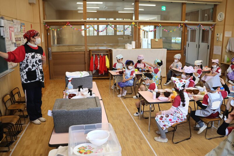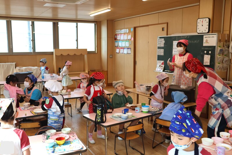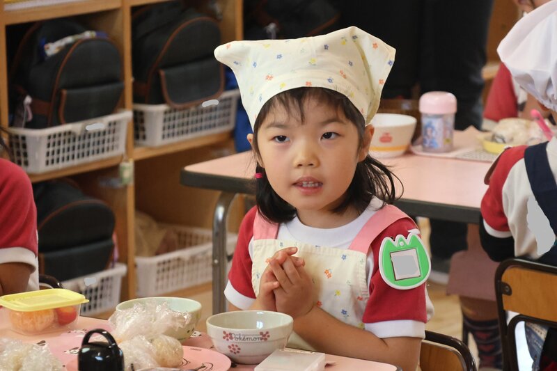 さあ、ハードなメニューだった「体操指導」が終わりました。「ゆり組」さんと「たんぽぽ組」さんは、ここから「つくってたべよう」がはじまります。