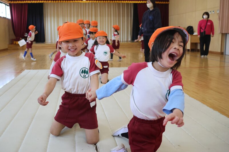 ふたり一組になっての「お芋コロコロ」。こちらなんか、もうふたりの息が合わないと大変な騒ぎです。