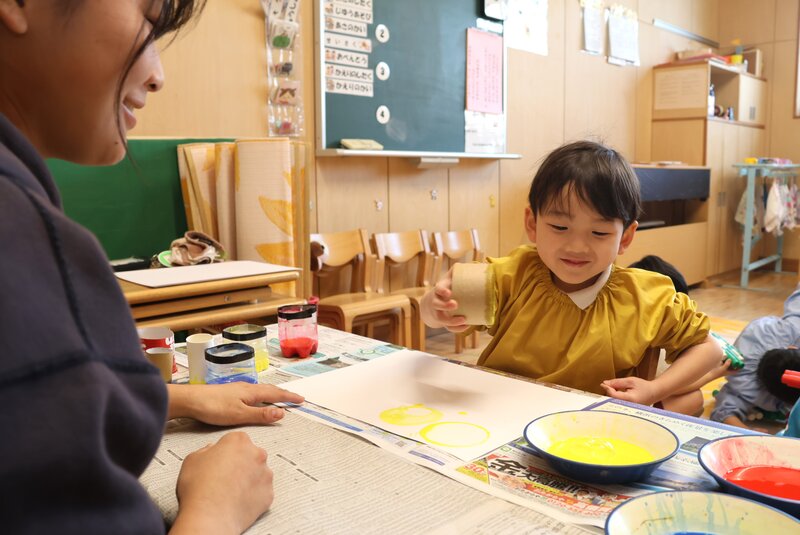 「くま組」さんは、ガムテープの芯でしょうか、丸い形に絵の具をつけてペッタンペッタンしていました。丸をたくさん描いて、どうするのでしょうか……???