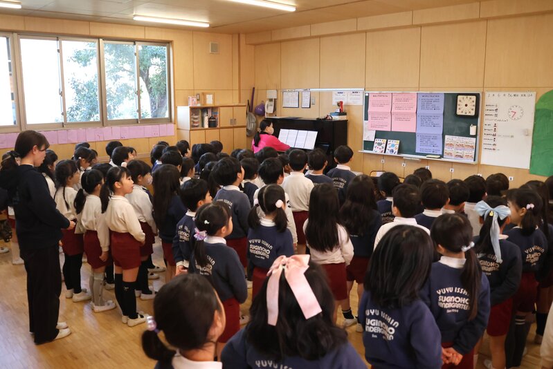 年長さんは、3クラスが「つき組」さんのお部屋に集まって、卒園式のうたの練習をしていました。先生のアドバイスを受けながら一生懸命に歌うお子さまたちの横顔をみていますと、年少さんで入園してきた頃のお顔が思い浮かんできます。成長しましたよね。残り少ない幼稚園生活を、精いっぱい楽しんでください。