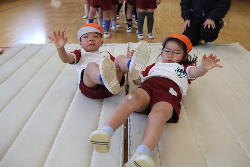 年中さんは、金曜日なので「体操指導」がありました。きょうのテーマは、「前転」です。こちらの女の子は、クルッとまわってフィニッシュが決まったところ。バッチリですね。実は、この「前転」の練習に入る前に何段階かのトレーニング・メニューがありまして……、