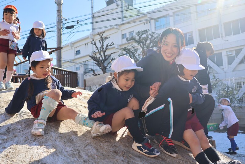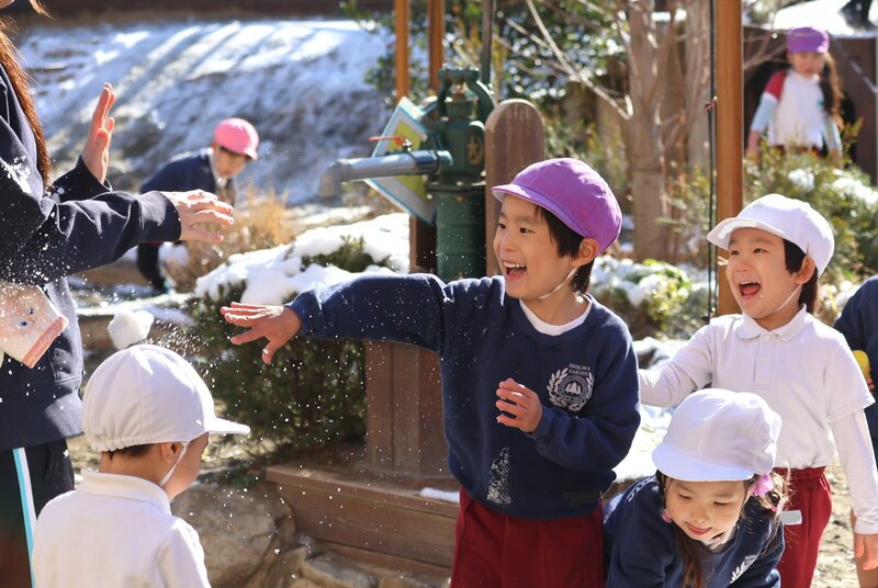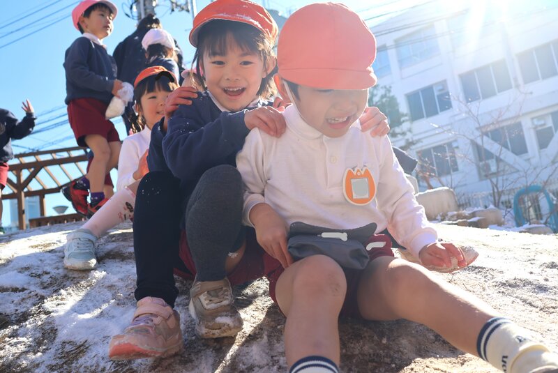 園庭に降りそそぐお日様の光と雪の白さが、お子さまたちのいきいきとした表情を一層、引き立ててくれているように感じます。