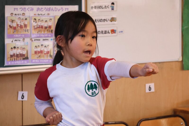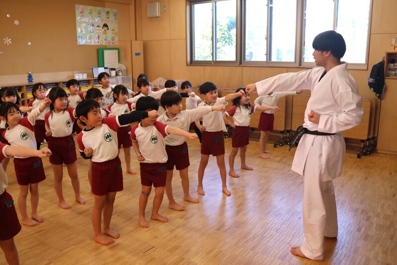 きょうのもうひとつの話題は、こちら。年長さんは「空手指導」がありました。指導してくださったのは、杉之子幼稚園の課外教室で「空手」を教えてくださっている「フィールズアカデミー株式会社」の指導員の先生です。